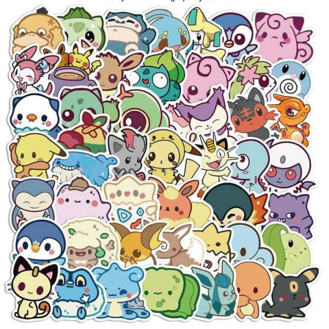 Színes Pokémon matrica csomag 50 darabos szettben, tökéletes ajándék Pokémon rajongóknak. Vízálló matricák laptopra, gördeszkára, és több felületre