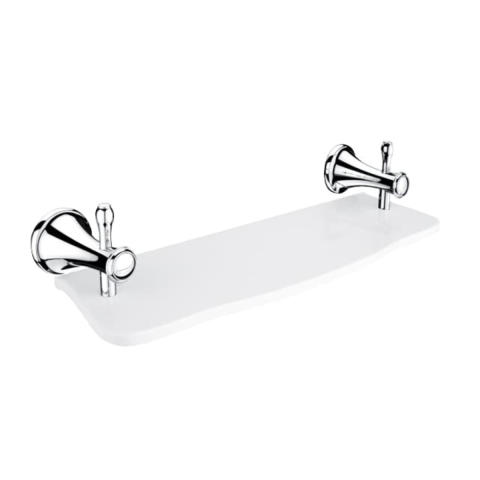 Fehér műkőből készült polcok. Hossza 40 cm. Fogantyúk sárgaréz, krómozott kivitelben.