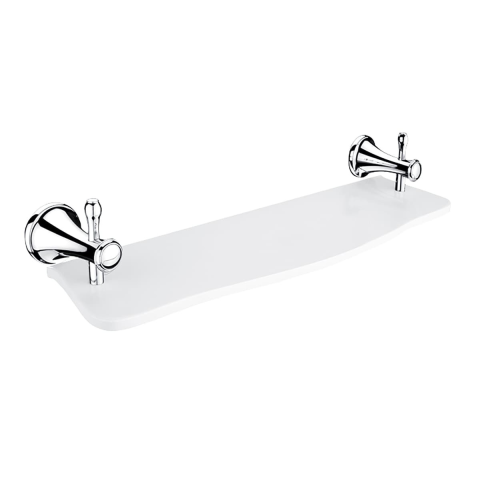 Fehér műkőből készült polcok. Hossza 50 cm. Fogantyúk sárgaréz, krómozott kivitelben.