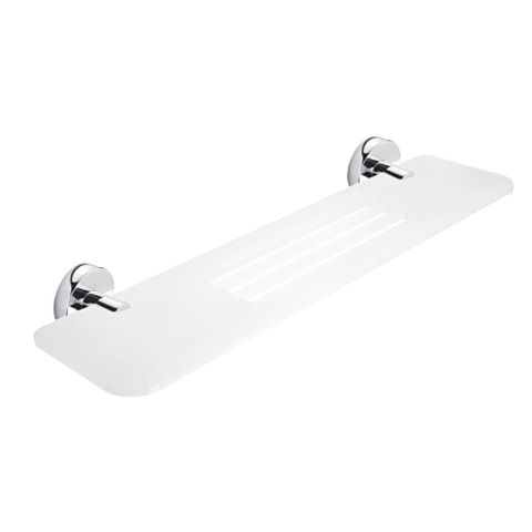 Polcok maratott lyukakkal. Anyaga matt felületű plexiüveg. Hossza 50 cm. Fogantyúk sárgaréz/króm.