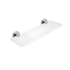 Polcok maratott lyukakkal. Anyaga matt felületű plexiüveg. Hossza 40 cm. Fogantyúk csiszolt rozsdamentes acél.