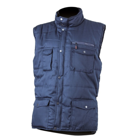 Meleg sokzsebes mellény Anyaga: 35% pamut, 65% poliészter, bélése 200 g/m2 poliészter Kényelmes poliamid belső, mely a karöltőnél gumírozva van Álló gallér két patenttal Derekat védő hosszított hátrész Egy belső és hét külső zseb Cipzáros plusz patentos