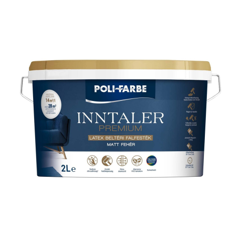 Inntaler Premium beltéri diszperziós falfesték fehér 2 l. Kiváló fedőképességű, vízzel hígítható, illatosított beltéri falfesték. Bevonata matt, esztétikus, jó pára-és légáteresztő. Kiszerelése: 2 l.
