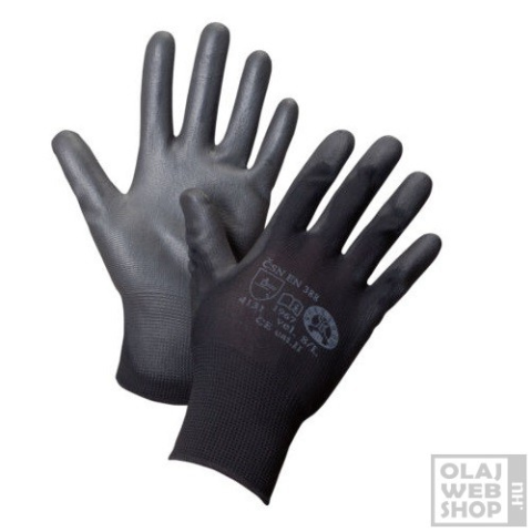 Kötött, varratmentes poliészter kesztyű vékony poliuretán bevonatú tenyérrel és ujjakkal, valamint rugalmas mandzsettával • kötött, rugalmas, nagy szakítószilárdságú 100% poliészter szál • tenyéren poliuretánnal mártott • precíziós kesztyű gumírozott m