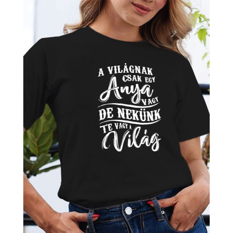 Póló anyának, ajándék édesanyáknak, a világnak csak egy anya vagy, de nekünk Te vagy a világ felirattal. Népszerű ajándék anyák napjára, de bármilyen olyan alkalomra amikor anyukádat szeretnéd meglepni valami különleges ajándékkal. A póló többféle színben