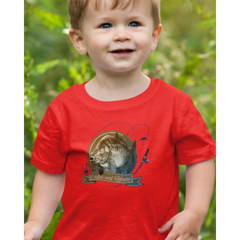 Horgász gyerek póló, Catch and Release. Kifogni és elengedni, ha a te rokonod, barátod is ezen az elven pecázik, tökéletes választás lehet születésnapjára egy ilyen sporthorgász gyerek póló. Szép és tartós grafikával ellátott 100% pamut póló a vízparton i