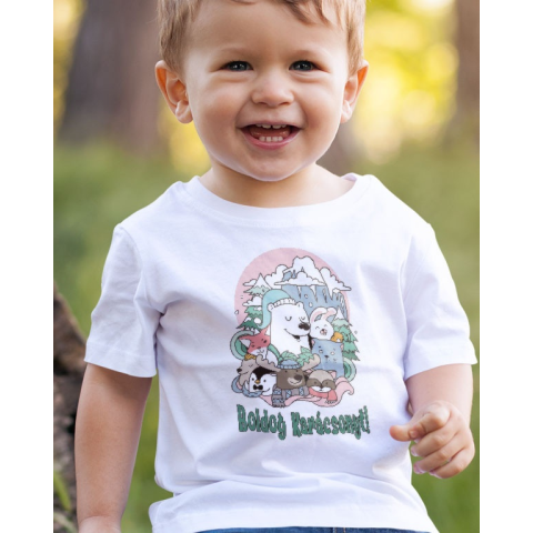Cuki állatos gyerek póló, Boldog Karácsonyt felirattal vidám mintával, ami mindenkinek mosolyt csal az arcára akkor is ha gyermeked viseli vagy ha ajándékba adod. Akár az egész család részére rendelhető többféle fazonban, színben és méretben. A póló anyag