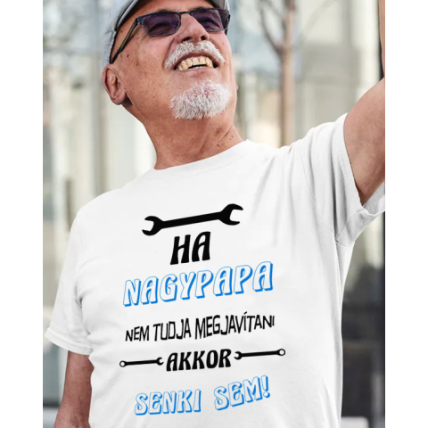 Póló nagyszülőnek, ha nagypapa nem akkor senki sem. Ajándék ezermester nagypapáknak. Rendelj neki Ha nagypapa nem tudja megjavítani, akkor senki sem feliratos pólót, és amikor ezt viseli garantáltan még azt is megjavítja, amit eddig esetleg nem tudott :)