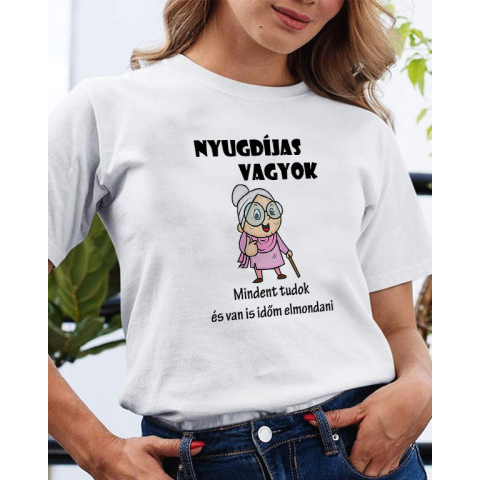 Póló nyugdíjasoknak, vicces ajándék néniknek. Meglepetés beszélgetni szerető családtagodnak, ismerősödnek Nyugdíjas vagyok, mindent tudok és van is időm elmondani feliratú egyenes vonalú, unisex póló, néni mintával. A póló többféle színben és méretben re