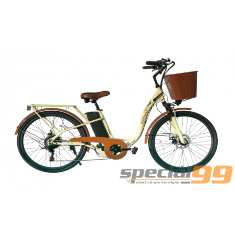 Női elektromos túrakerékpár, Li-Ion akkumulátorral, LED-es első lámpával, 6 sebességes Shimano váltóval, három fokozatú motornyomaték kapcsolóval, pedál rásegítő és energia visszanyerő rendszerrel. A mozgást és természetet szerető hölgyek kedvence. Kivál