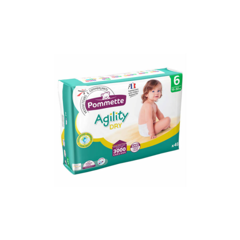 Pommette pelenka (6-os) 15 - 30 kg (48 db/cs) Kiszerelés: 3 csomag/karton.Pommette Agility pelenka (6-os méretben)Kifejezetten 15-30 kg-os babák részére kifejlesztve48 db-os kiszerelésVékony kialakítás, a kényelmes viseletértSpeciális maxidry technológ