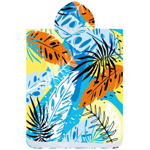 A Strand poncsó SUMMER FRESH vidám színes mintájú pálmalevelekkel kiváló társ a vízparti lazításhoz. A 80 x 145 cm-es méreteknek köszönhetően kényelmes ruha, törölköző és nap- vagy szélvédelemként is szolgál. Az oldalt található patentok, a kapucnis, bő szabású kialakítás és a vállakat fedő ujjak maximális kényelmet biztosítanak.