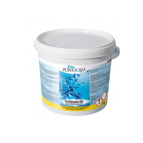 A Pontaqua Gyorsaklór klórgranulátum medencék gyors fertőtlenítésére, klórszintjének beállítására ajánlott szer. Jellemzői: Stabilizált szilárd klórgranulátum 56% aktív klórtartalommal Gyorsan és melléktermék nélkül oldódik Ellenáll a napfény és hő hatás