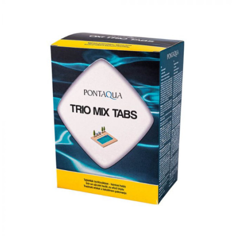Pontaqua TMT006 Trio Mix Tabs hármas hatású vízkezelő szer 5x125 g tabletta Általános leírása: 3 db lassan oldódó 20 grammos klórtabletta, 2 db gyorsan oldódó 20 grammos klórtabletta és 1 db 25 grammos pelyhesítő tabletta egy textilzsákba csomagolva. A l