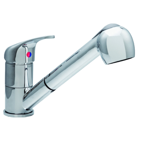 Álló mosogató csaptelep kihúzható zuhany fejjel. Műszaki adatok: Maximális üzemi hőmérséklet 70 C. Kerámiabetétes elzáróegység, 40 mm átmérővel. 8 mikronos krómozással. Fém karral. 3/8-os 30 cm-es bekötőcsővel. Vízáteresztő képesség 13 l / perc fölött.