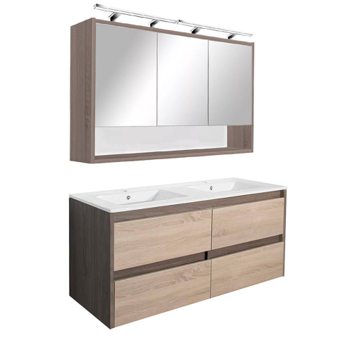Leziter Porto 120 komplett mosdóval – rauna szil–sonoma tölgy Szín: Rauna szil korpusz, sonoma tölgy front Szélesség: 120 cm Alsó szekrény méret: 120 × 55 × 46 cm Felső szekrény méret: 120 × 67 × 20 cm Mosdó: Fehér, dupla medencés