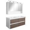 Leziter Porto 120 komplett mosdóval – fehér–rauna szil Szín: Fehér korpusz, rauna szil front Szélesség: 120 cm Alsó szekrény méret: 120 × 55 × 46 cm Felső szekrény méret: 120 × 67 × 20 cm Mosdó: Fehér, dupla medencés kerámia, két