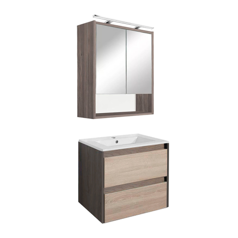Leziter Porto 60 komplett rauna szil–sonoma tölgy – alsó és felső fürdőszobabútor mosdóval Szín: Rauna szil korpusz, sonoma tölgy front Szélesség: 60 cm Alsó szekrény méret: 60 × 55 × 46 cm Felső szekrény méret: 60 × 67 × 20 cm