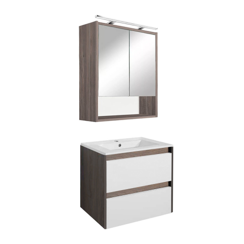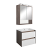 Leziter Porto 60 komplett rauna szil–fehér – alsó és felső fürdőszobabútor mosdóval Szín: Rauna szil korpusz, fehér front Szélesség:60 cm Alsó szekrény méret:60 × 55 × 46 cm Felső szekrény méret:60 × 67 × 20 cm Mosdó:Fehér, m