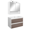 Leziter Porto 80 komplett – fehér–rauna szil Szín:Fehér korpusz, rauna szil front Szélesség:80 cm Alsó szekrény méret:80 × 55 × 46 cm Felső szekrény méret:80 × 67 × 20 cm Mosdó:Fehér, mélymedencés kerámia, egy csaptelephellyel Tá