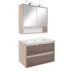 Leziter Porto 80 komplett – sonoma tölgy–rauna szil Szín: Sonoma tölgy korpusz, rauna szil front Szélesség: 80 cm Alsó szekrény méret: 80 × 55 × 46 cm Felső szekrény méret: 80 × 67 × 20 cm Mosdó: Fehér, mélymedencés kerámia, egy