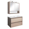 Leziter Porto 80 komplett – rauna szil–sonoma tölgy Szín: Rauna szil korpusz, sonoma tölgy front Szélesség: 80 cm Alsó szekrény méret: 80 × 55 × 46 cm Felső szekrény méret: 80 × 67 × 20 cm Mosdó: Fehér, mélymedencés kerámia, egy