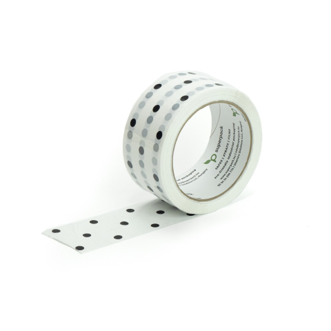 A Superpack S45 fehér alapon fekete pöttymintás verziója amellett, hogy praktikus, még a legunalmasabb csomagolást is feldobja. Kifejezetten esztétikusan mutat natúr kraft dobozokon, csomagolóanyagokon. Csendes letekerésű, akril ragasztóréteggel ellátott