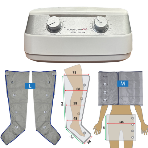 Láb és csípő/far kezelő készlet nagy méretű láb és normál méretű öv mandzsettákkal. Ár tartalma: Power Q-1000 Plus készülék (1db); Láb mandzsetta: L méret (1pár, azaz 2 lábra); Öv mandzsetta: M méret légtömlő (1db); Légtömlő: 4 elvezetéses (1db); 2x4 elve