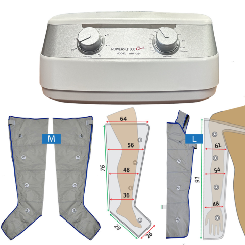 Láb és kar kezelő készlet normál méretű láb és nagy méretű kar mandzsettákkal. Ár tartalma: Power Q-1000 Plus készülék (1db); Láb mandzsetta: M méret (1pár, azaz 2 lábra); Kar mandzsetta: L méret (1db); Légtömlő: 4 elvezetéses (1db); 2x4 elvezetéses (1db)