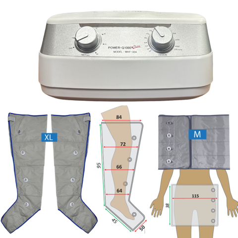 Láb és csípő/far kezelő készlet extra nagy méretű láb és normál méretű öv mandzsettákkal. Ár tartalma: Power Q-1000 Plus készülék (1db); Láb mandzsetta: XL méret (1pár, azaz 2 lábra); Öv mandzsetta: M méret légtömlő (1db); Légtömlő: 4 elvezetéses (1db); 2