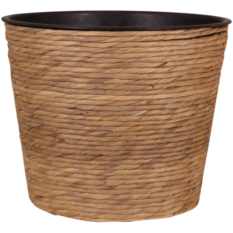 A modern megjelenésű, terjes mértékben kézműves kaspó nem csak divatos megjelenésű, hanem természetes anyagokból is készült. A kaspó egy vízálló tömör fekete műanyag belső edényt tartalmaz, amely biztosítja a vízállóságot. Csak beltérben használható. Anyaga: műanyag, jácinttal burkolva. Színe: natúr/barna-fekete. A kaspó átmérője 40 cm, magassága 32 cm.