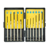 Órás csavarhúzó szett fém nyéllel, 11 db-os. Forgó ujjtámasszal ellátott végű nyéllel. Műanyag tartóban. A szett tartalma: AWL pontozó Mágneses kiszedő csavarhúzók: lapos (SL) 1 mm lapos (SL) 1.2 mm lapos (SL) 1.4 mm lapos (SL) 1.8 mm lapos (SL) 2.4 mm