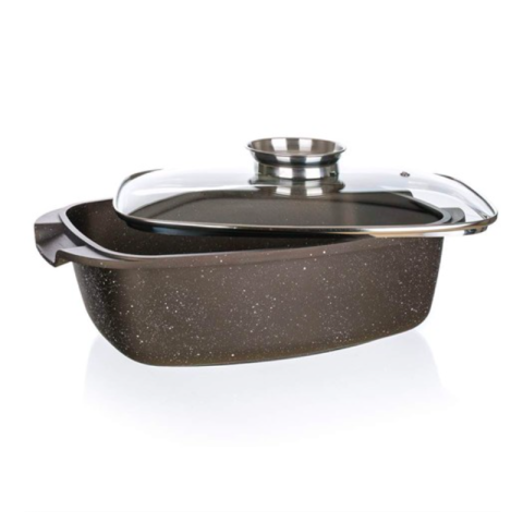Alumínium öntvény pecsenyesütő üveg termo fedővel és aroma fedőfogantyúval, PREMIUM DARK BROWN tapadásmentes bevonattal, méret 32 x 20 x 11 cm, barna gránit minta, falvastagság 2,2 mm, teljesen indukciós talp.