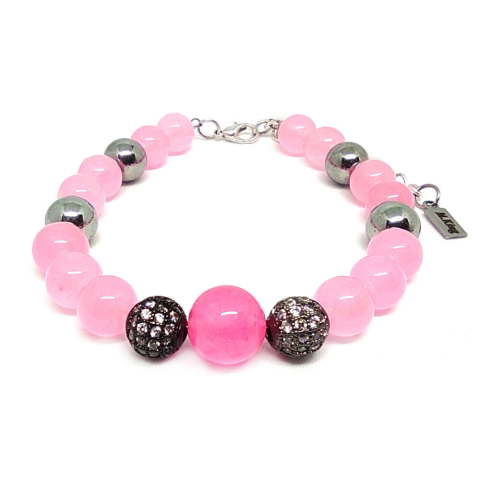 Figyelem! Nem szakad, nem nyúlik! Tartós ékszer. Az ékszer ásványai és tartozékai: – 10 és 8 mm-es pink Jade ásványok – 8 mm-es strasszos pavé charmok – 8 mm-es ezüst hematit gyöngyök – M.King márkajelzésű nemesacél logóbiléta