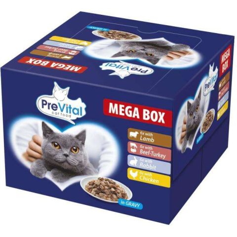 PreVital alutasakos Mega Box 24x100 g bárány-marha-nyúl-csirke macskaeledel termékleírás
