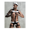 Prisoner férfi jelmez-4részes.Rugalmas felső ami gumis pánttal össze van kötve a gumis combhámokkal.Rugalmas alsónadrág.Sapka.Fém bilincs.