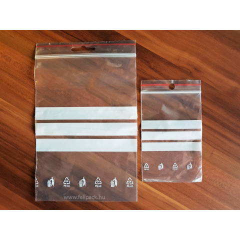 Önzáró simítózáras tasak akasztólyukkal, írható felülettel. Golyóstollal, alkoholos filctollal írható felülettel ellátva.Méret: 160 x 220 x 0,05 mm (szélesség x hosszúság x vastagság)A legkisebb választható mennyiség: 100 db,1000 db-os kiszerelés esetén kedvezőbb az ára.