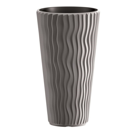 Magas virágcserép, térfogata 45 l, hullámos textúrájú kialakítás, kül- és beltérre egyaránt alkalmas, praktikus betétet tartalmaz a növények ültetéséhez, méretei 39 x 70,8 x 39 cm, szürke színű. Tedd beltéri vagy kültéri növényeidet a Prosperplast SAND