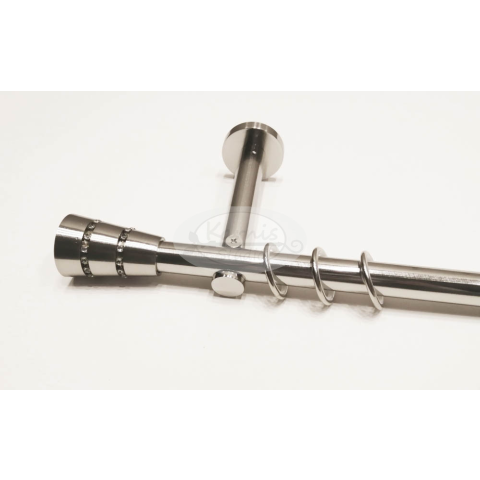 A PROVINS 1 rudas, 160 cm-es fém karnis szett tartalma: 1 db 19 mm átmérőjű, 160 cm hosszú fém karnisrúd (fényes inox színben) 2 db Provins típusú, strasszkövekkel díszített fém karnis végzáró 2 db falra szerelhető fém konzol 16 db szilikon betétes fém k