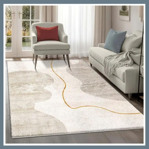 Puha bársony szőnyeg, Aranyvonal minta 150x200cm UV1252517-2Ez a puha bársony szőnyeg a modern eleganciát és finom luxust képviseli otthonodban. Különleges „Aranyvonal” mintája lágy, absztrakt formákkal és harmonikus krém, bézs, valamint halványszürke színárnyalatokkal varázsol kifinomult hangulatot bármely enteriőrbe. A szőnyeg központi dekorációját jelentő arany színű ívelt vonal exkluzív és stílusos megjelenést biztosít. Praktikus mérete (150x200 cm) i