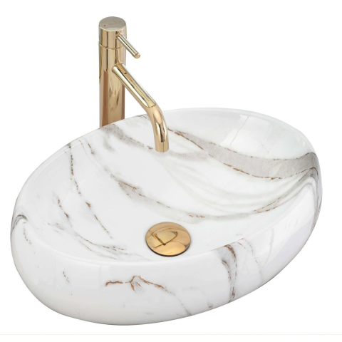 Ovális márvány mintás mosdó - Elegáns fürdőszoba design ✨ Ez a gyönyörű ovális mosdó modern és elegáns megjelenést kölcsönöz fürdőszobájának. Kiváló minőségű egészségügyi kerámiából készült, tartós és könnyen tisztítható. A márvány mintázat exkluzív...