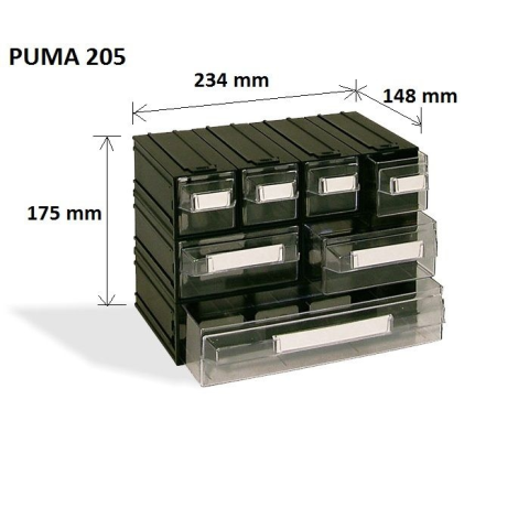 PUMA 205 fiókos tároló rendszer, 7 db fiókkal. Átlátszó, címketartós fiókokkal. A papír címkék a termék részei. Professzionális kivitelezésű, méretpontos, formatartó. Önállóan is használható, de oldalukon, aljukon, tetejükön kialakított hornyokkal egymás