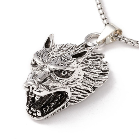 Látványos punk rock farkasos medál nyaklánccal, fémötvözet. Méret: nyaklánc hossza 60 cm, anyaga rozsdamentes acél, 2.5 mm széles, farkas: 46x27x15 mm, anyaga fémötvözet. Rendkívül látványos férfi nyaklánc, vagány, ütős ékszer.