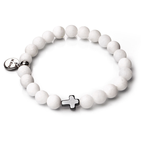 RUGALMAS KARKÖTŐ, a mérete választható.Az ékszer ásványai és tartozékai:– 8 mm-es matt fehér jade gyöngyök– Hematit Kereszt, 10x8 mm– M.King márkajelzésű nemesacél logóbiléta a csatnál– Technika: rugalmas, tartós gumidamil.