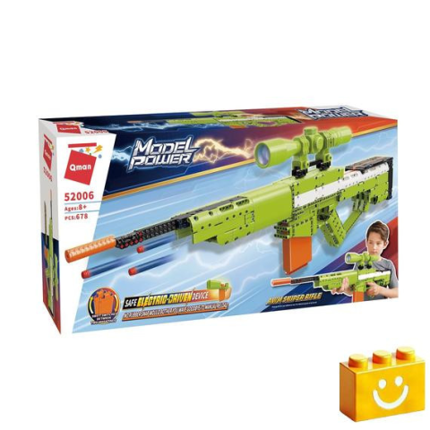 QMAN® márkájú, minőségi, technic-kompatibilis építőjáték. Szivacstöltények kilövésére is alkalmas játékfegyver. Élethű 85,5 cm hosszú AWM mesterlövész puska, elektromos hajtású újratöltéssel, két db tárral és 8x-os nagyítású távcsővel. A játék 678 db épí