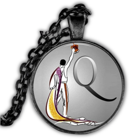 Egyedi Queen nyaklánc üvegbúrás medállal. Freddie Mercury ikonikus alakja és a Q betű díszíti. Tökéletes ajándék rajongóknak