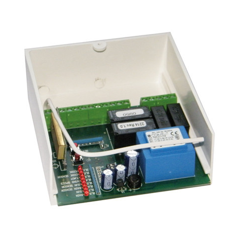 Redőnyvezérlés, beépített 433.92MHz vevő, felfűzhető, IP54, 230VAC. Univerzálisan alkalmazható vezérlés redőnymotorokhoz. A beépített rádiós vevőegység a távvezérlőkön kívül vezeték nélküli szél/nap/eső érzékelő kezelésére is alkalmas, így számos kénye