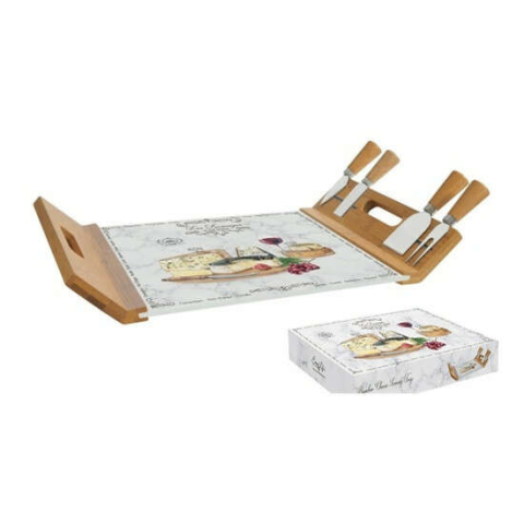 Sajttál szett bambusz vágódeszkával és 4 db sajtkéssel - 44x28cm Ez a gyönyörű sajttál szett tökéletes választás a sajtok szerelmeseinek! A bambusz vágódeszka elegáns megjelenést kölcsönöz az asztalnak, míg a négy különböző sajtkés segítségével könny...