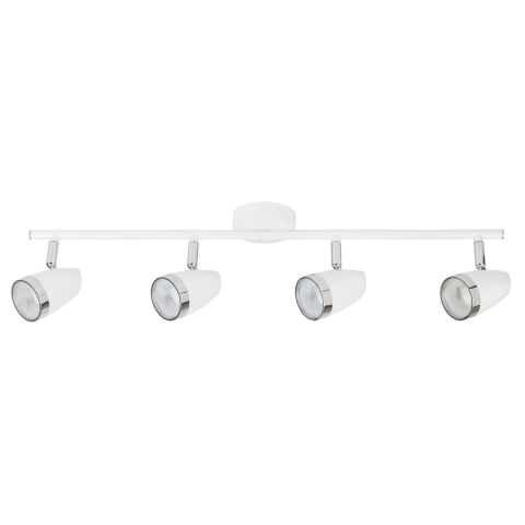 Modern megjelenésű mennyezeti spotlámpa, 4 db beépített energiatakarékos LED fényforrással. 60,5 cm széles, fehér és króm színű, fémből és műanyagból készített lámpatest pozícionálható lámpabúrákkal. A beépített LED-es lámpa teljesítménye 4x4 W, melyhez 4x280 lumen fényerő társul. Színhőmérséklete meleg fehér (3000 Kelvin). A lámpatestben elhelyezett fényforrások nem cserélhetők.