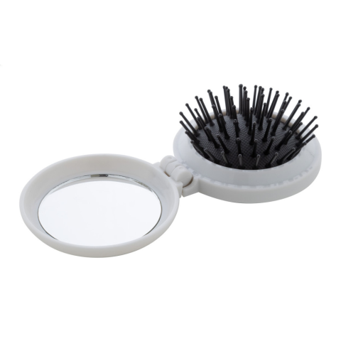 Összecsukható, újrahasznosított ABS hajkefe zsebtükörrel.